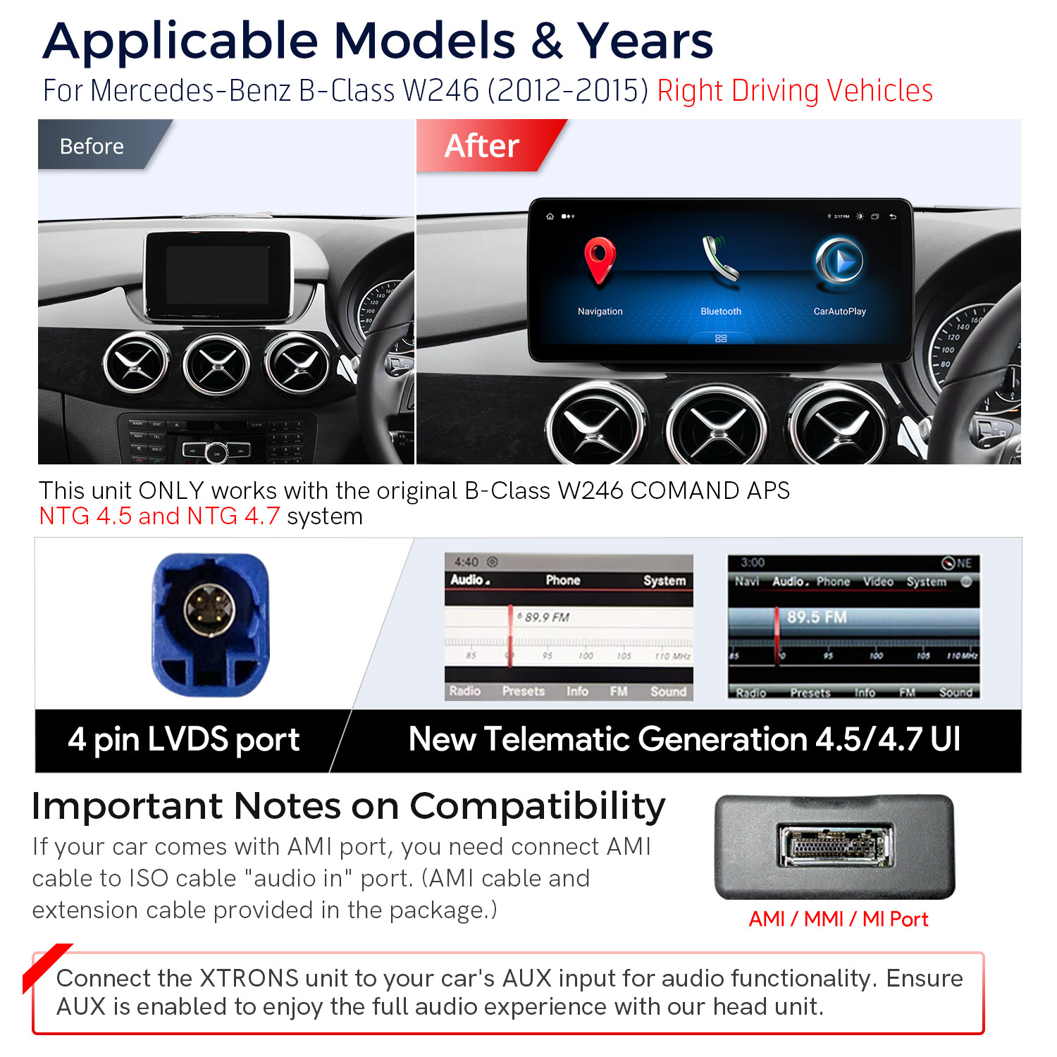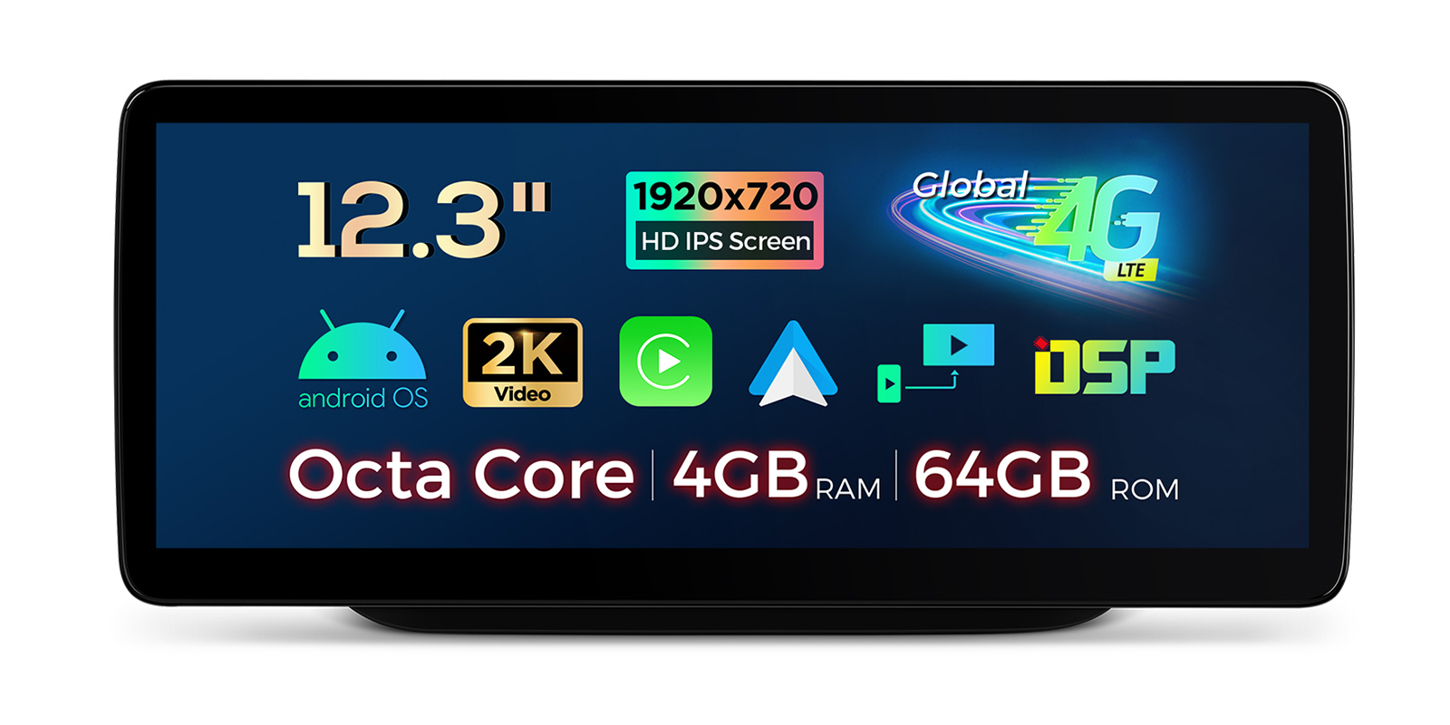 12.3″ Fully-laminated 1920×720 HD IPS Screen Android 13 Car Stereo with New Concept Design 4GB DDR4 RAM 64GB EMMC ROM Integrated Global 4G LTE Solution Wireless CarAutoPlay Android Auto Built-in DSP Support 2K Video Playback Screen Mirroring Support AHD Reversing Camera Retain Original COMAND System for Mercedes-Benz B-Class W246 Right Driving with NTG 4.5 or NTG 4.7 System