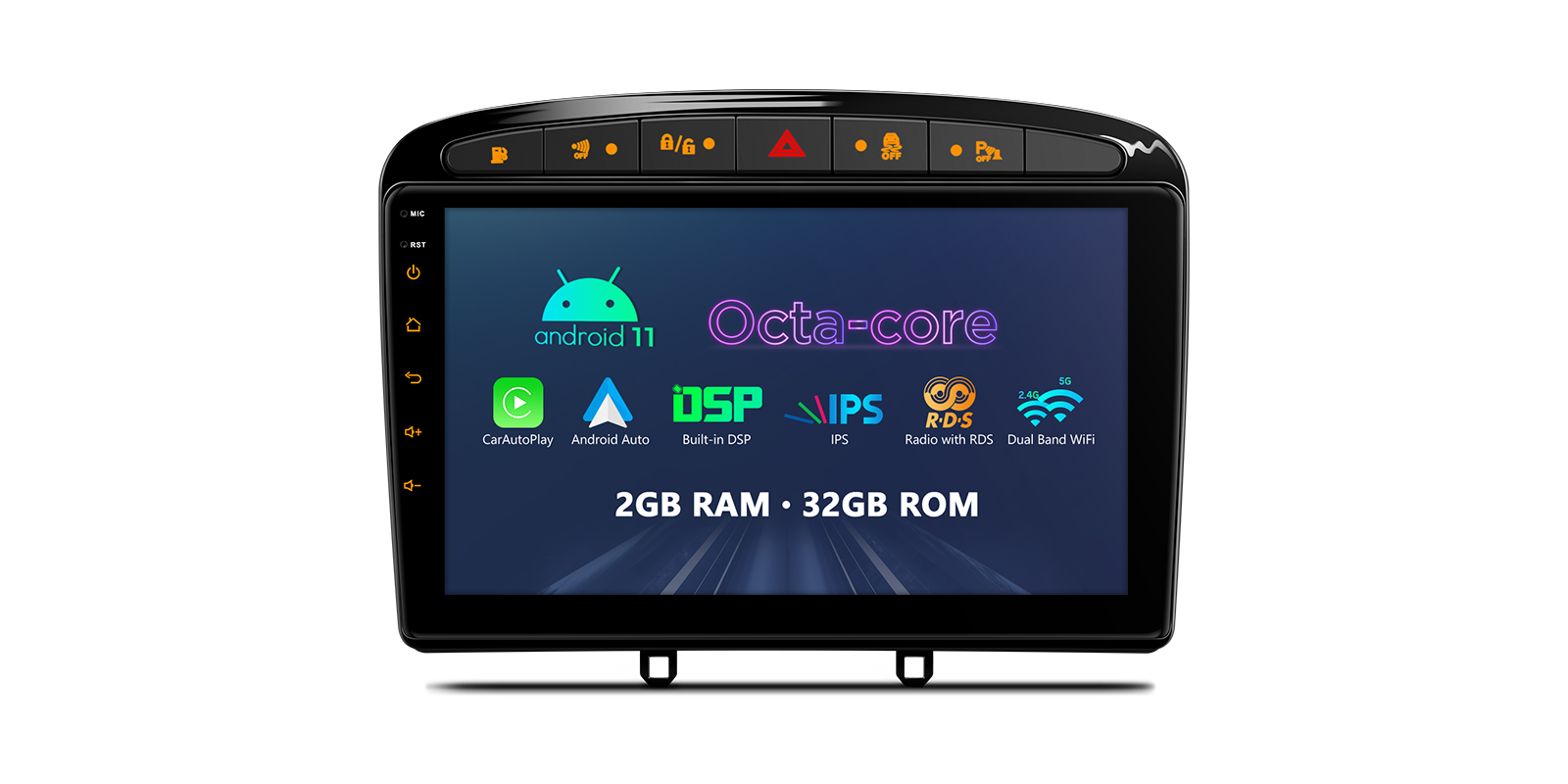 Android 12 Octa Core 2GB DDR4 RAM + 32GB ROM 9” 1280×720 IPS Screen Car Stereo Multimedia Player GPS Navigation System with Dual UI Automotive-grade Hardware Built-in CarAutoPlay & Android Auto & DSP Radio with RDS Coaxial Audio Output Custom Fit for Peugeot